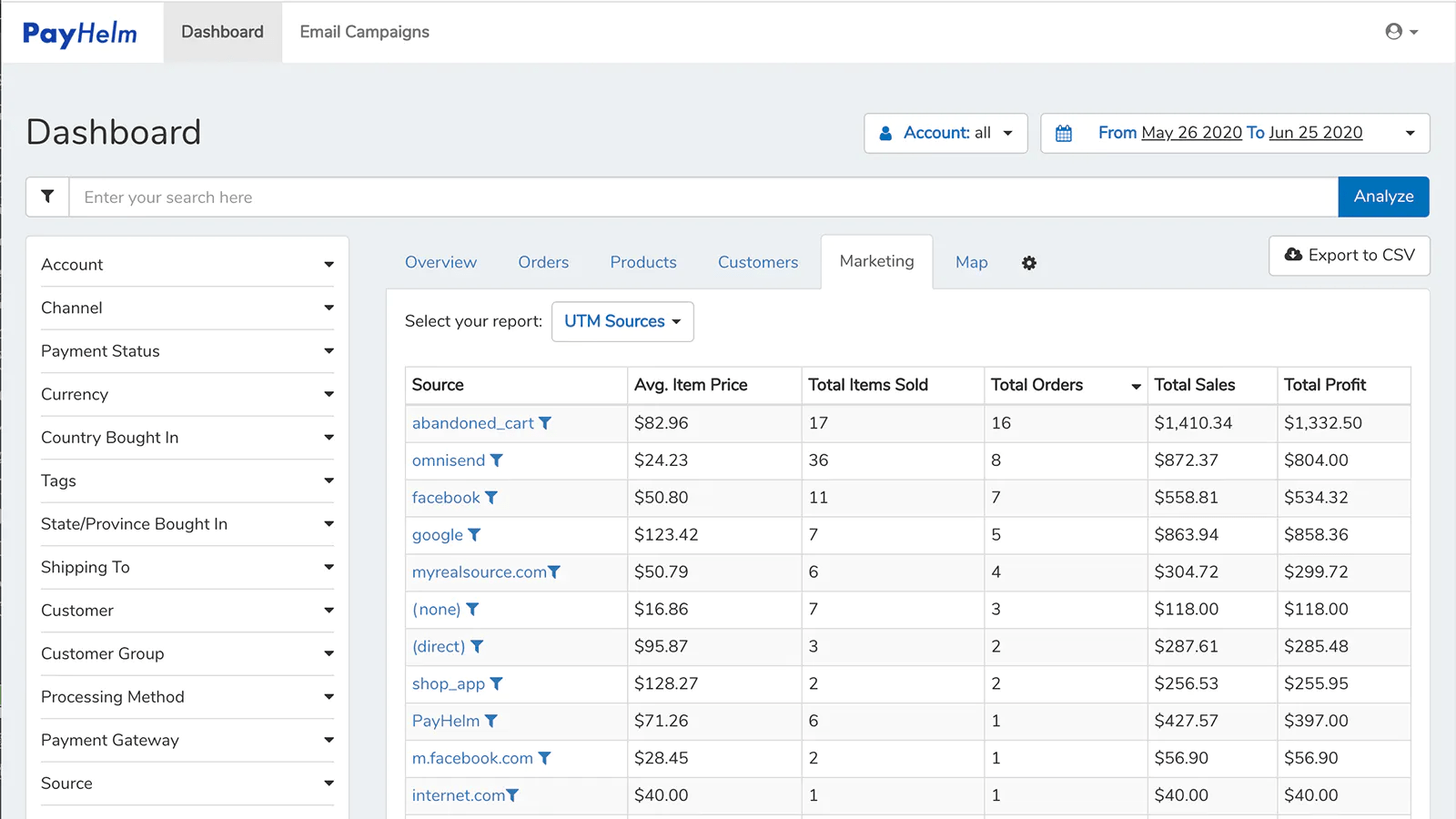 - Analyze your products by total sales, orders, avg. price, gateway fees, product cost, profits, & more.